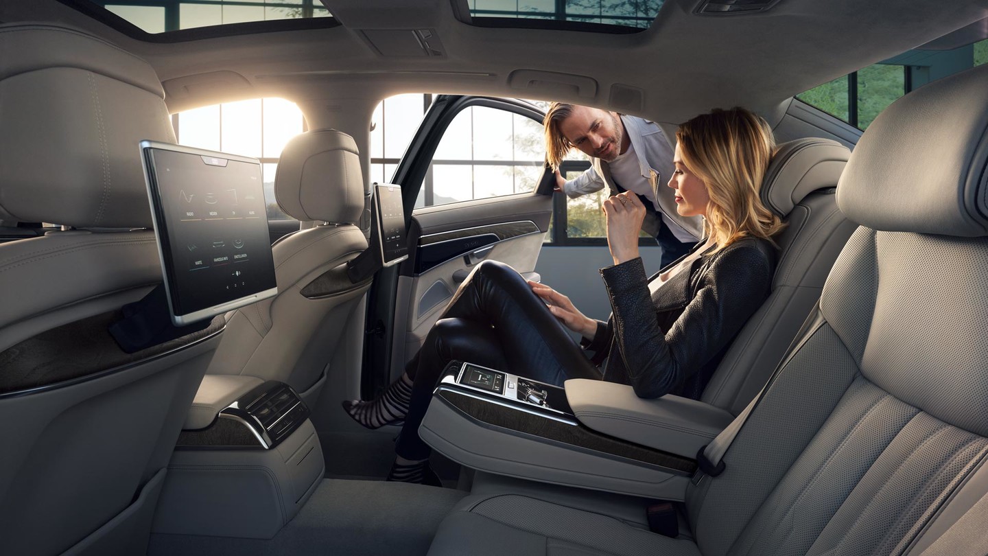 Che si tratti di un viaggio su brevi o lunghe distanze, potrete sempre contare su Audi A8 L per arrivare a destinazione in totale relax. Ve lo garantisce una vasta gamma di funzioni che, con le loro specifiche operazioni comfort, soddisfano anche i requisiti più impegnativi prima, durante e dopo il viaggio. Audi A8 estende il classico piacere di guida anche alla soddisfazione di lasciarsi condurre. I passeggeri che si trovano nei confortevoli sedili posteriori godranno di una generosa quantità di spazio, ulteriormente e notevolmente aumentato rispetto al modello precedente. Mentre la tecnologia attiva del telaio offre un'esperienza di guida confortevole e dinamica senza limiti ed in ogni situazione, il design dell'illuminazione ambientale, insieme alle funzioni innovative di comfort e intrattenimento, garantirà una rilassante esperienza di viaggio ai più alti livelli. Difficile trovare un qualsiasi altro rifugio in cui potersi rilassare mentre si viaggia sulla nuova Audi A8. Il massimo comfort di seduta è offerto al sedile posteriore lato passeggero, grazie a una vasta gamma di opzioni di regolazione, alla funzione optional di massaggio e alla presenza di un poggiapiedi, utile per una posizione di riposo particolarmente confortevole. Inoltre, il sedile del passeggero può essere portato elettricamente in avanti, il suo schienale può essere ripiegato per aumentare lo spazio per le gambe. Tutto ciò, unito alla funzione massaggio ai piedi sul poggiapiedi e all'intrattenimento offerto dagli Audi Tablets rende perfetto il rifugio posteriore di Audi A8.