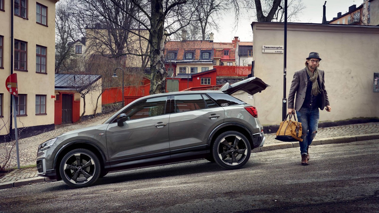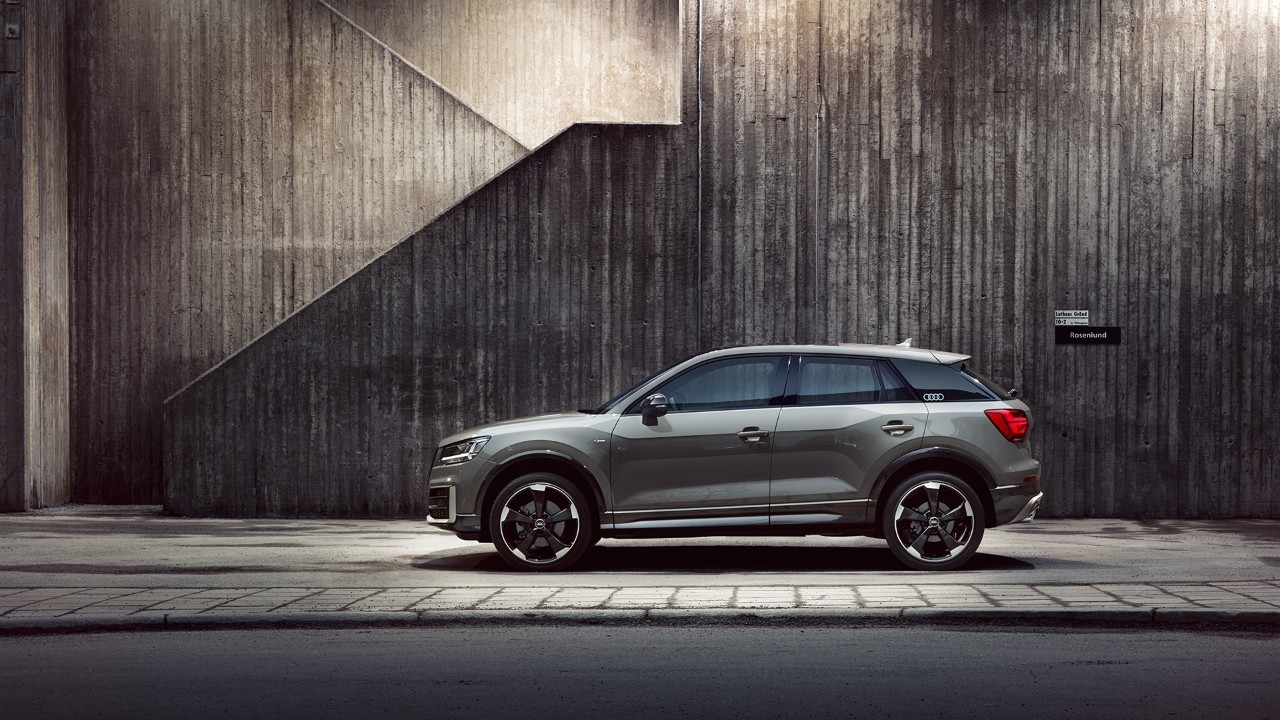 Si lascia particolarmente apprezzare il tetto basso e discendente, che confluisce in un montante posteriore dove un inserto colorato realizza un contrasto cromatico che enfatizza la sportività di Audi Q2. Il posteriore termina con un lungo spoiler al tetto e un diffusore con funzione di protezione sottoscocca che ne accentuano il dinamismo. La vista laterale è dominata dall’alta linea di cintura e da fianchi rientrati nella zona delle portiere.