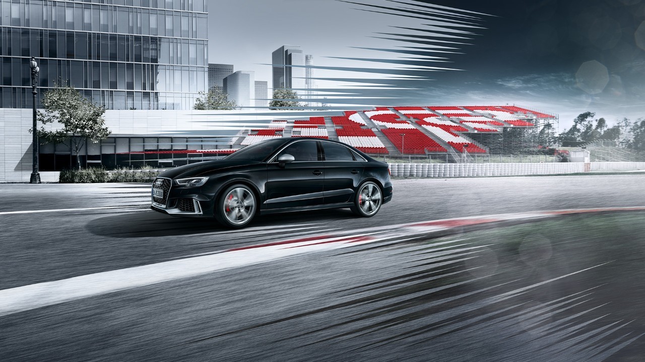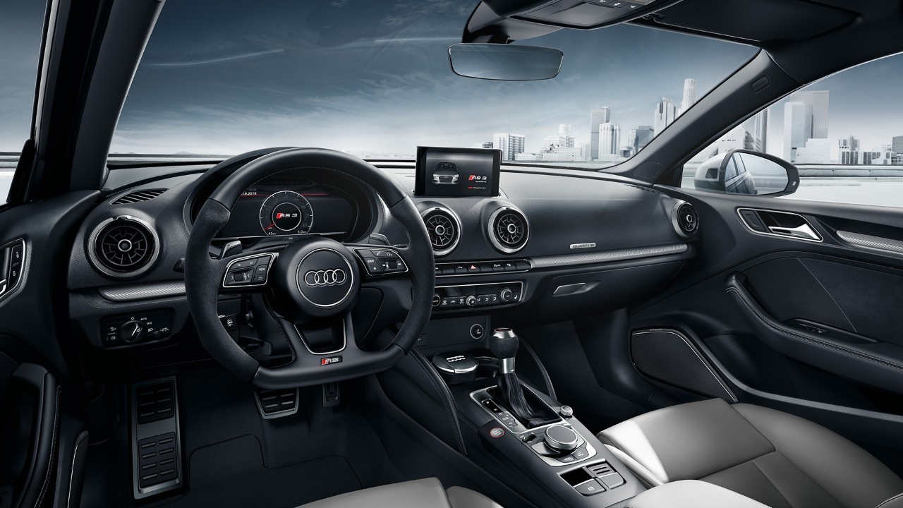 L’abitacolo, dalle tonalità scure, accoglie il conducente e il passeggero anteriore con i listelli sottoporta illuminati di serie con logo RS 3. I sedili sportivi in pelle Nappa nera con logo RS agli schienali sono di serie. A richiesta sono disponibili sedili sportivi RS con fianchetti più pronunciati e appoggiatesta integrati. I rivestimenti sono inoltre trapuntati con motivo a losanghe e traforati. Il volante sportivo in pelle RS è appiattito nella parte inferiore e presenta sezioni laterali in Alcantara. Gli inserti nella plancia e alle portiere completano l’atmosfera di eleganza sportiva. Il pacchetto design RS, disponibile a richiesta, completa il carattere grintoso dell’auto con inserti di rosso nelle cuciture e negli anelli delle bocchette di aerazione.