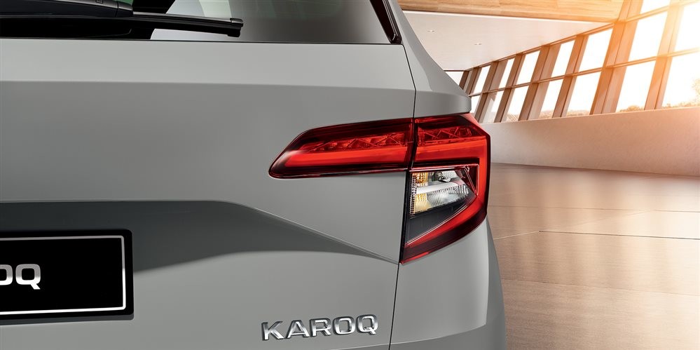 Le luci posteriori dalla caratteristica forma a C si ispirano alla tradizione ceca della lavorazione del cristallo. I gruppi ottici sono suddivisi in parti distinte: la prima si estende lateralmente nella fiancata, mentre la seconda è integrata nel portellone. I catadiottri “occhio di gatto”, che assicurano una migliore visibilità della vettura, si trovano in profondità nel paraurti posteriore, a vantaggio della protezione dai danni. KAROQ è provvisto anche di una robusta copertura protettiva.